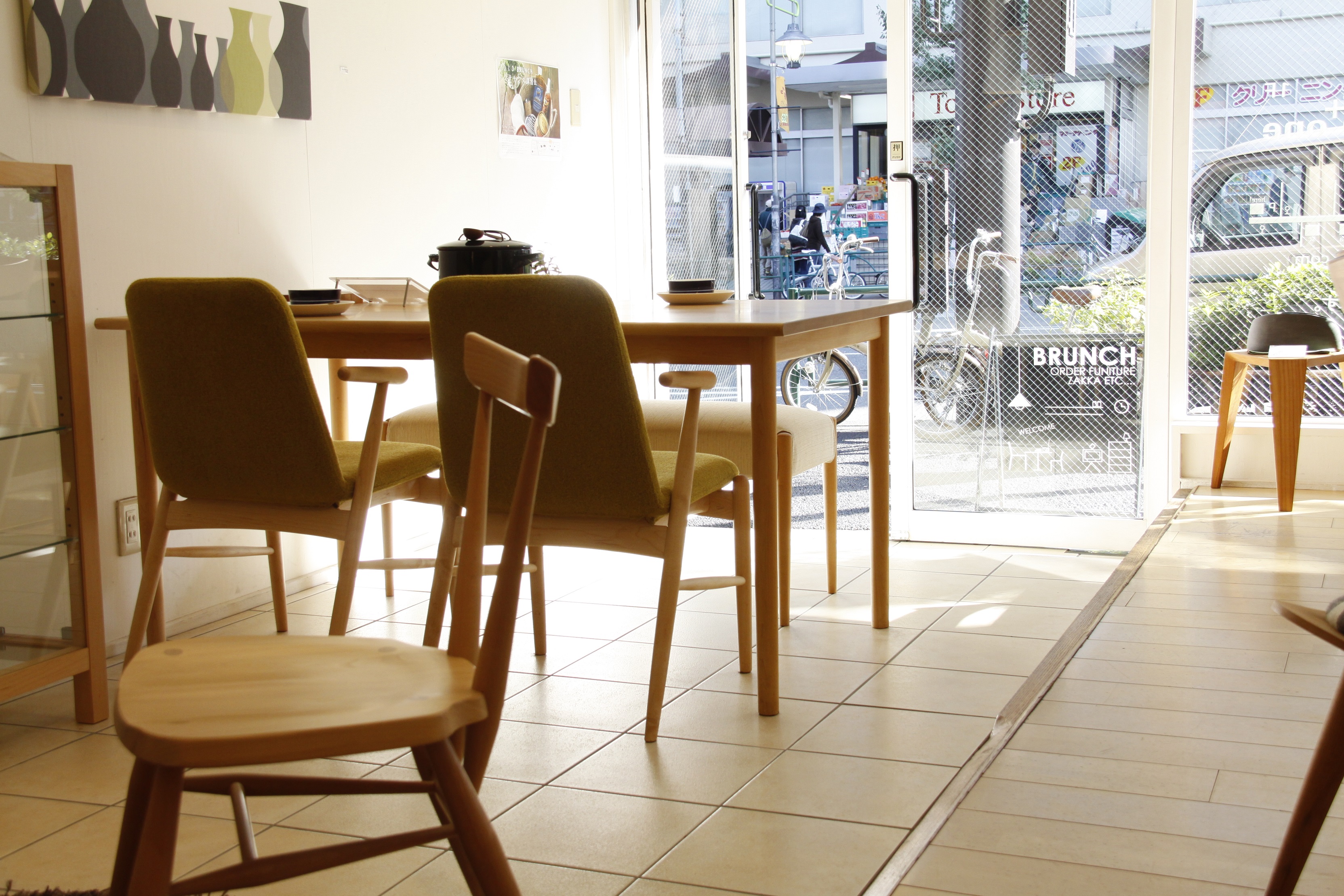 ちなみに最初の写真は店内から撮影したメープル材を使用した家具たちと目黒通りの様子です。